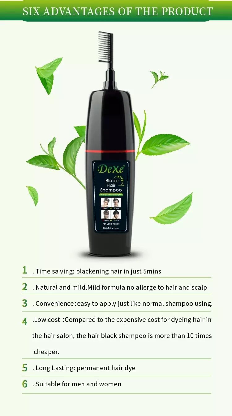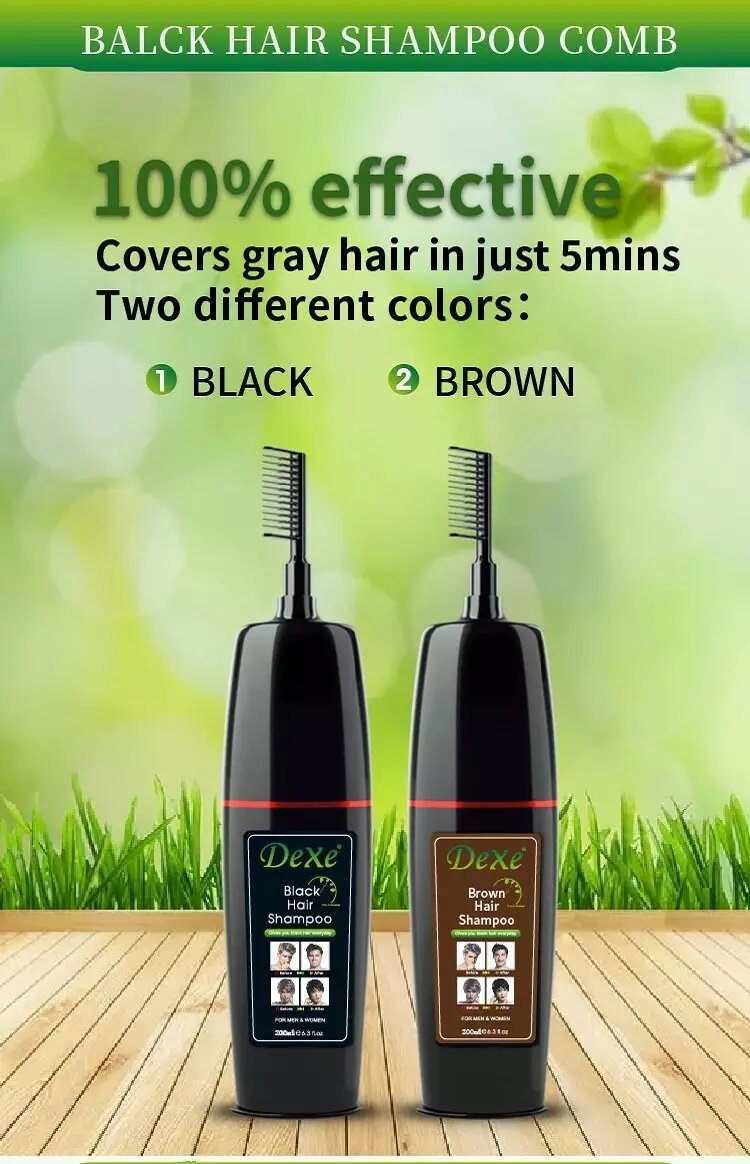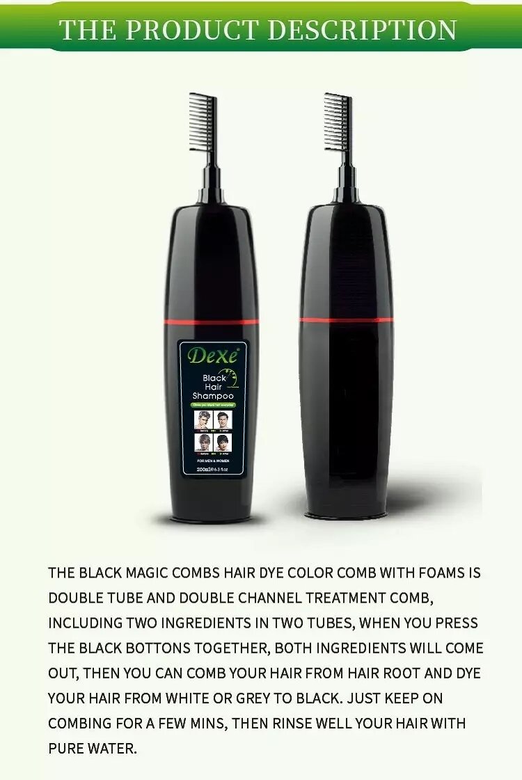আপনি কি পাকা চুল নিয়ে চিন্তিত? আপনার জন্য আমরা নিয়ে এসেছি চমৎকার সমাধান। DEXE শ্যাম্পুটি ব্যবহারে ন্যাচারাল হেয়ার কালার ফিরে পাবেন মাত্র ৫ মিনিটে। এটি কোন কালার নয় এটি একধরনের স্মার্ট শ্যাম্পু। এই শ্যাম্পুটি ১০০% হালাল ও এলার্জি মুক্ত। হারবাল উপাদানে তৈরি ফলে কোন প্রকার সাইড ইফেক্ট নাই। নিয়মিত ব্যবহারে চুল দেখাবে আরো স্বাস্থ্যজ্জল, ঘন, কালো ও সিল্কি । হাত/স্কিনে কোনো প্রকার দাগ লাগবে না ! তবে নখে দাগ লাগতে পারে তাই সাথে প্লাস্টিক গ্লোবস দেয়া থাকবে ব্যবহার করার সময় অবশ্যই গ্লোবস হাতে লাগিয়ে নিবেন! একবার ব্যবহার করলে চুল বা দাড়ি ৩-৪ সপ্তাহ পর্যন্ত কালো থাকে ।